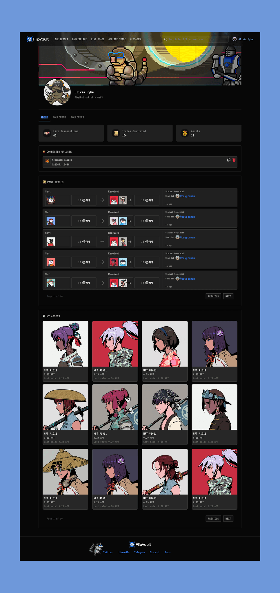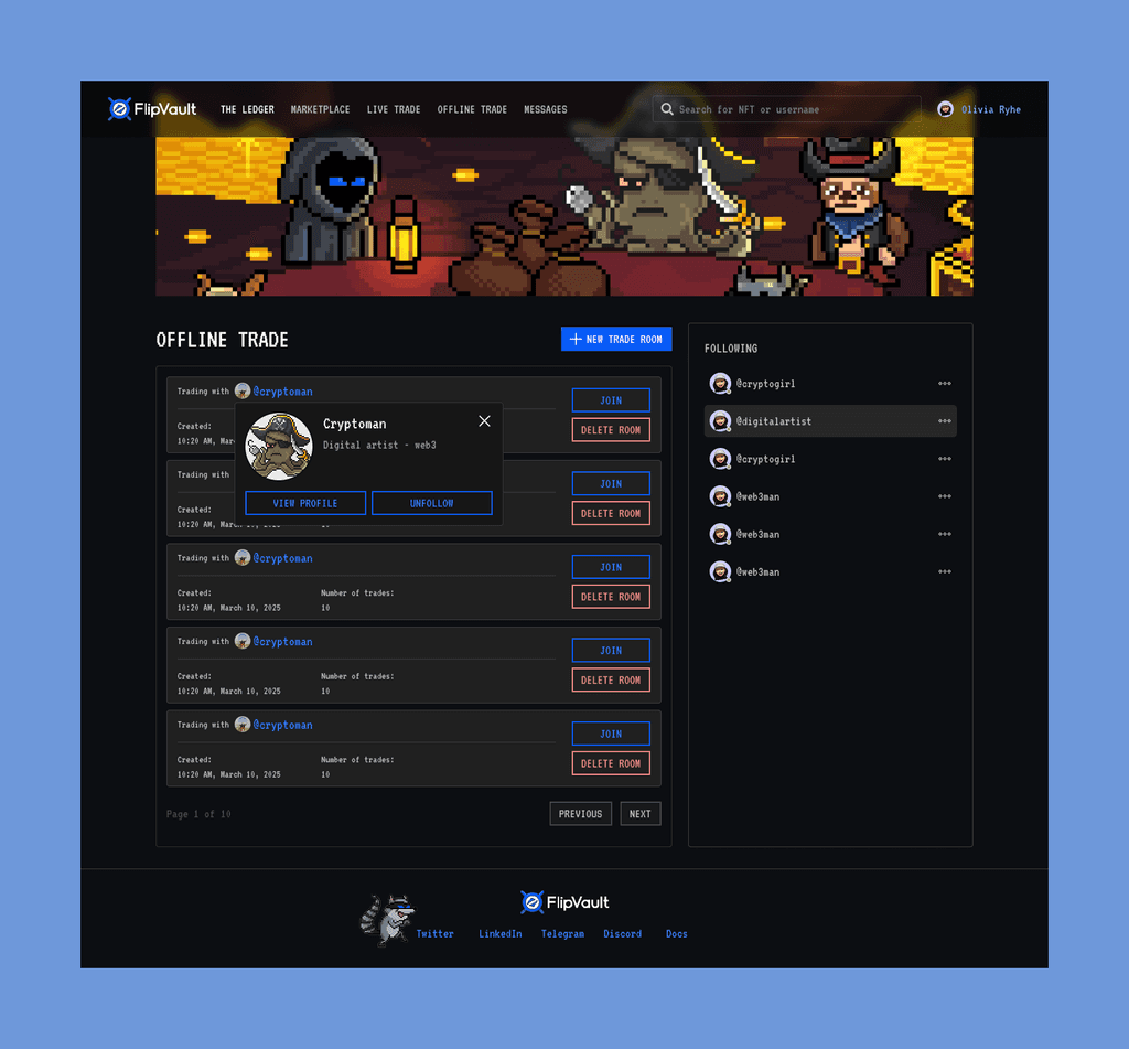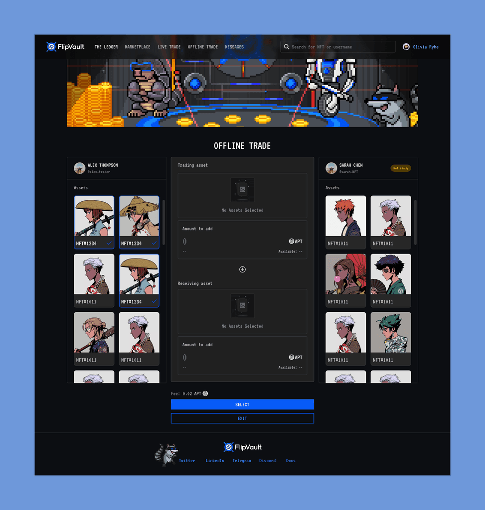 Flip Vault is a project focused on NFT trading and creating an NFT marketplace. Here, users can easily trade NFTs with each other through both online and offline trading options. With a user-friendly interface and convenient features, Flip Vault offers a seamless and secure trading experience for the NFT community.