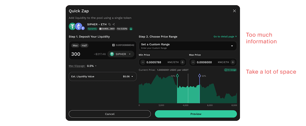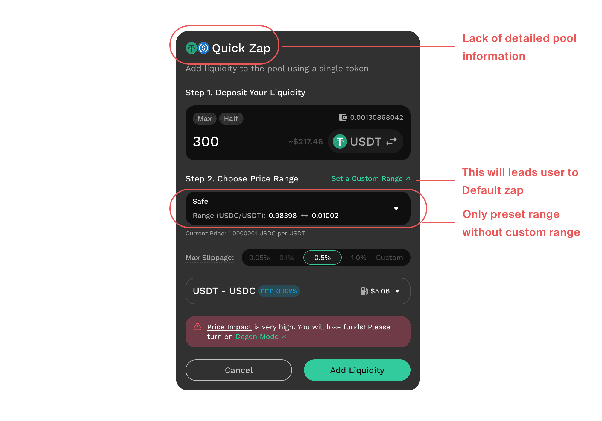 The current UI of Quick Zap lacks the flexibility for users to customize their range. Many interruptions occur during the flow from Zap to Stake, which can be frustrating for users.