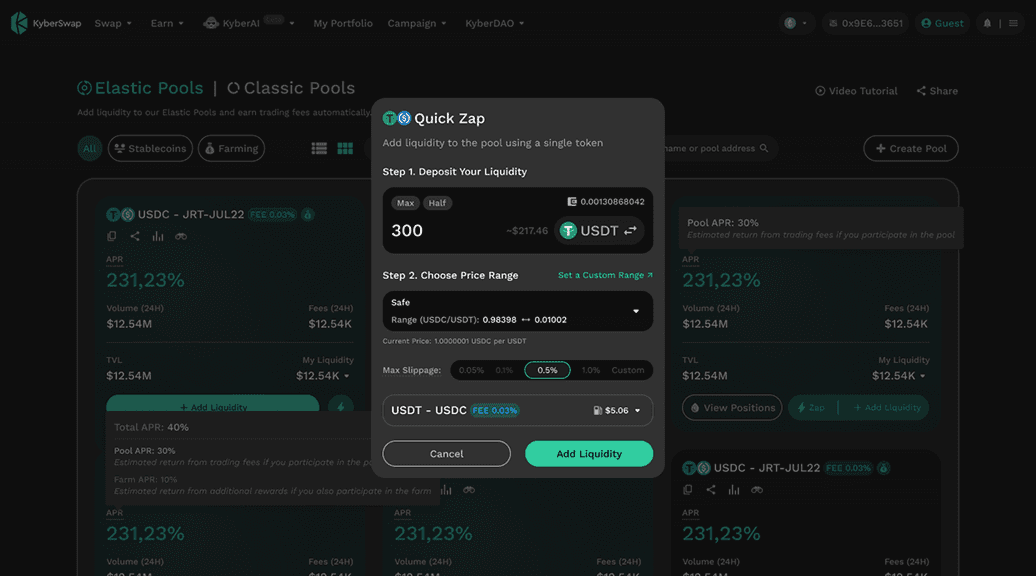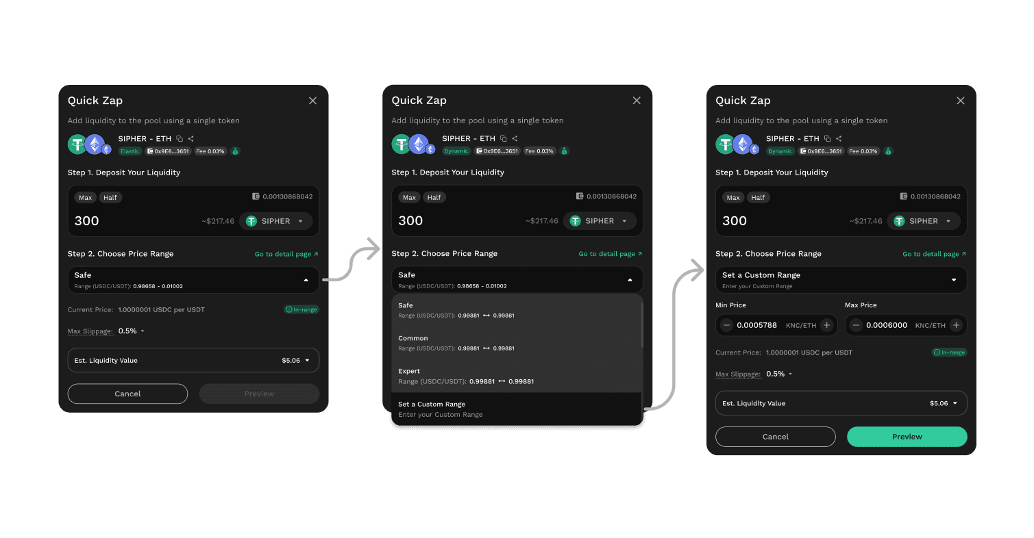 Zap is our latest feature that allows users to contribute liquidity to the pool using only one token. It involves an improved Quick Zap flow while providing users with the flexibility to adjust their position and still benefit from its quick functionality.