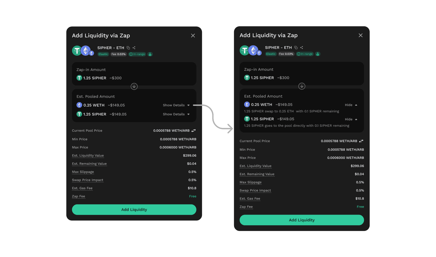 Another issue with the current Zap is that users are unaware of the amount of token A that will be swapped into token B and the efficiency of the amount being used for the Zap.