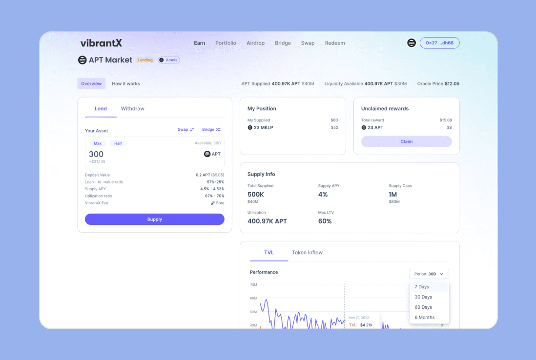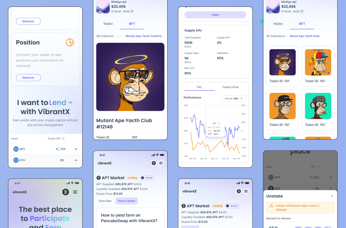 VibrantX Finance is a decentralized finance (DeFi) platform built on the Aptos blockchain, offering innovative financial services such as lending, borrowing, and yield farming. I designed the platform from start to finish, focusing on creating a user-friendly interface and ensuring a seamless user experience. My role encompassed everything from user research to UI/UX design, resulting in a secure and efficient platform that enhances asset management for users.